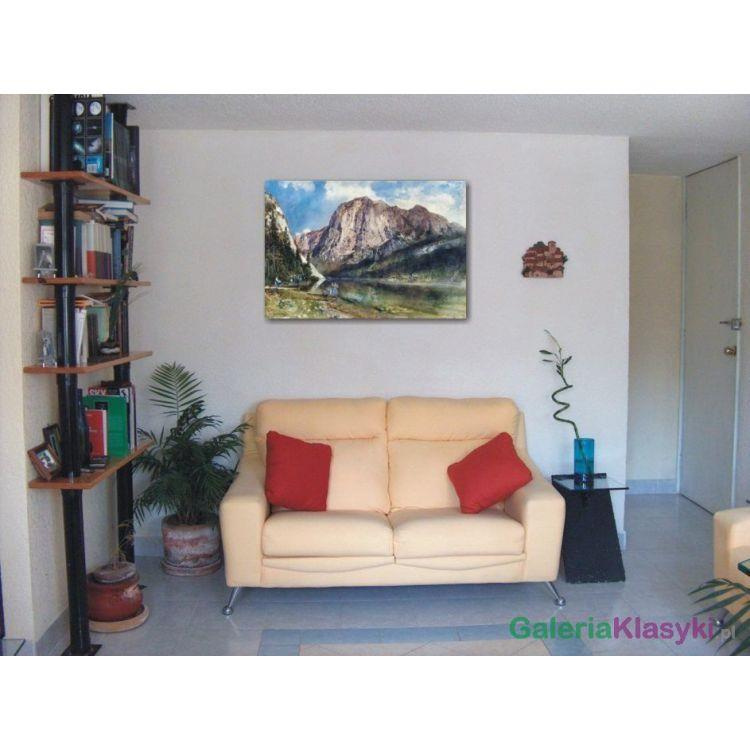 Reprodukcja przedstawiająca jezioro, a w tle szczyt górski. Idealnie nadaje się do powieszenia w salonie, sypialni czy domku letnoskowym nad jeziorem.