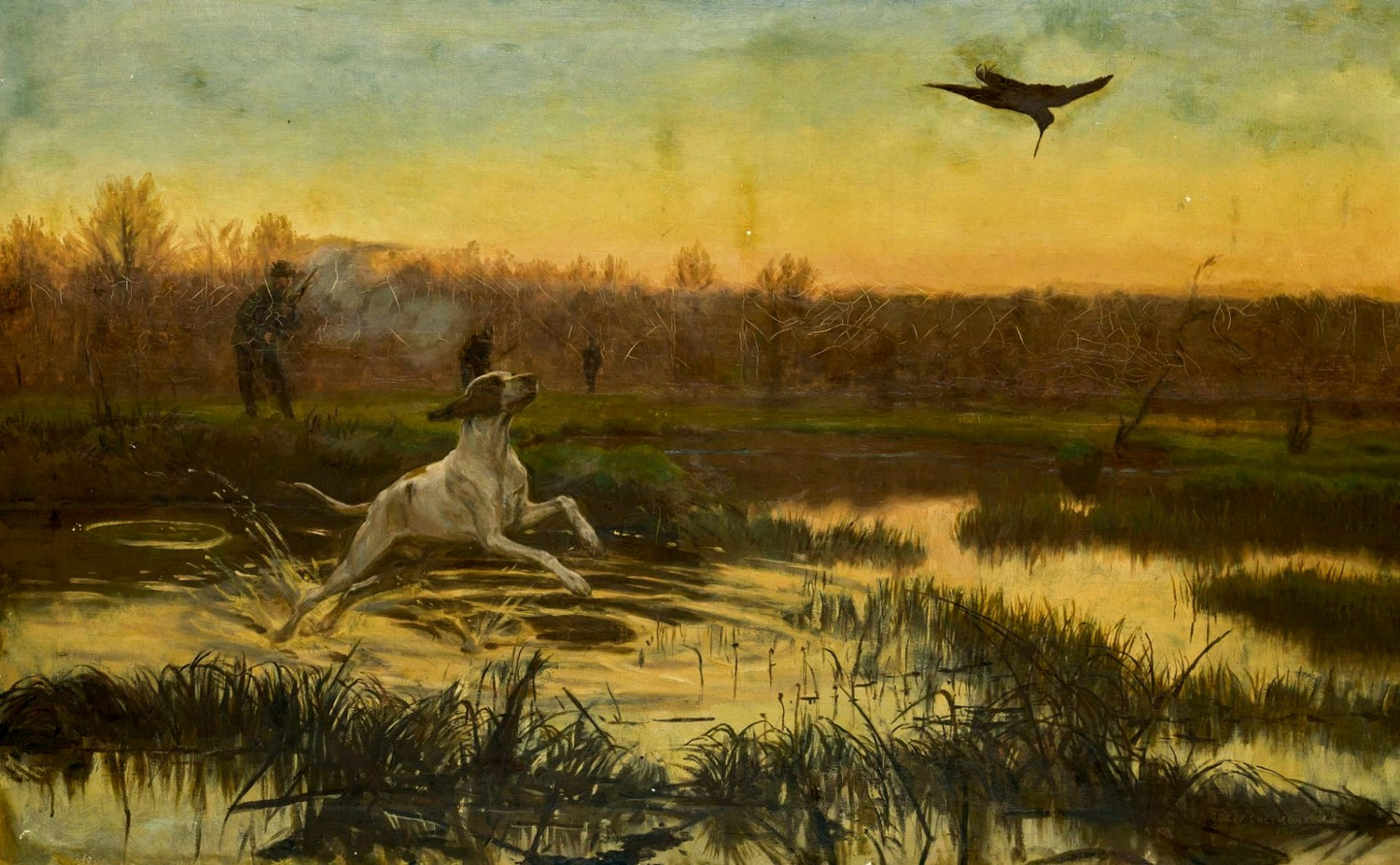 „Polowanie na łące” to niezwykłe dzieło Józefa Chełmońskiego, które mistrzowsko oddaje ruch, emocje i piękno dzikiej natury. W centrum kompozycji widzimy psa myśliwskiego w pełnym pędzie, skaczącego przez mokradło w pogoni za spłoszonym ptakiem. W tle, pośród mglistych konturów drzew i rozlewiska, majaczy postać myśliwego, gotowego do oddania strzału. Całość rozgrywa się w ciepłym, złocistym świetle zachodzącego słońca, które dodaje obrazowi nastrojowości.