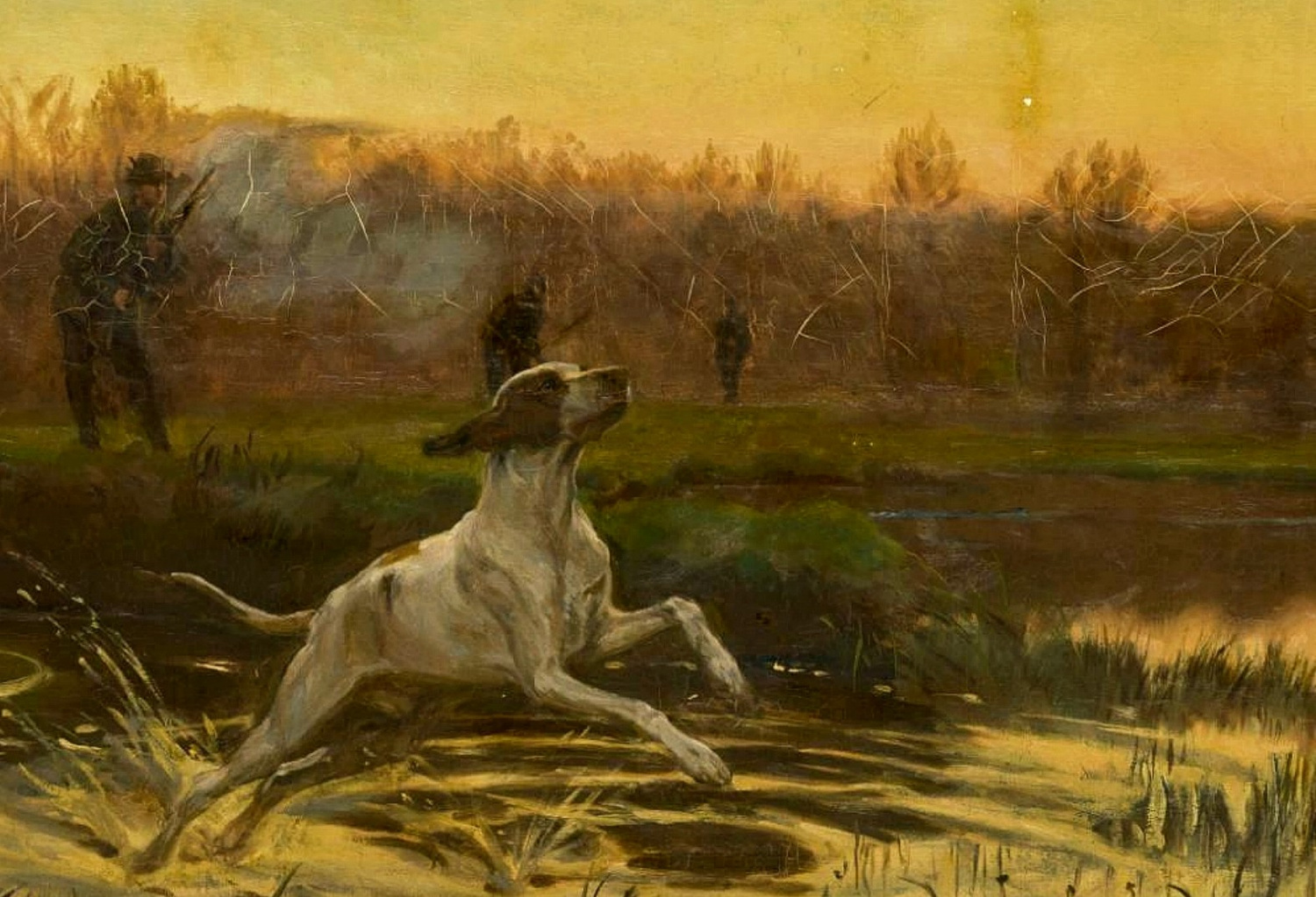 - „Polowanie na łące” to pełne emocji dzieło, które uchwyca moment napięcia i dynamiki myśliwskiej sceny. Pies myśliwski, rozbryzgujący wodę w pogoni za ptakiem, myśliwy w tle i złocisty blask zachodzącego słońca tworzą niezwykle realistyczny obraz.